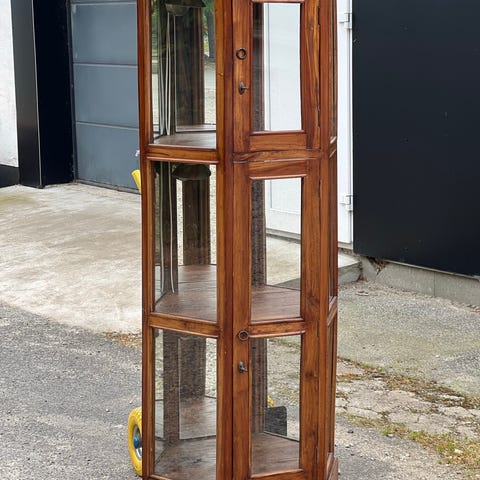 Vitrinskab med hylder og glas hele vejen rundt.
