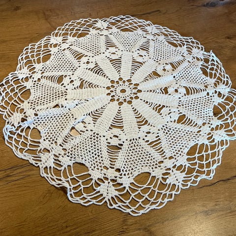 ❄️Ægte vintage håndarbejde. Hæklet/broderet. Brugt, så der kan forekomme kaffepletter og mindre skader, huller og slid, så se venligst alle billeder for stand. Kan bruges som den er, men kan måske også bruges til noget kreativt krea projekt?