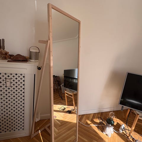 IKEA spejl med smal træramme til ophæng på væg. Rektangulær model i fuld kropslængde, egnet til entré, soveværelse eller garderobe. Neutralt design, der passer ind i de fleste indretninger.
