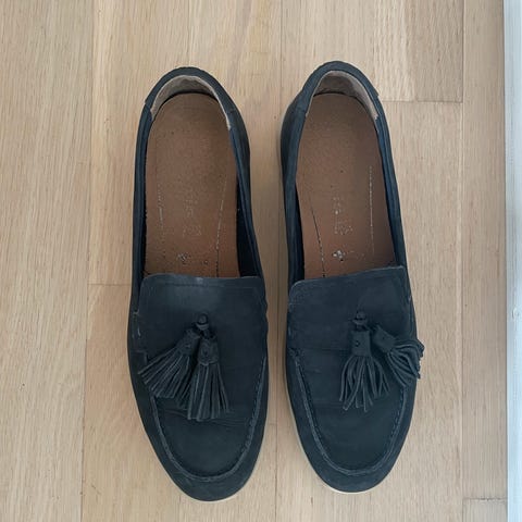 Tamaris loafers og sejlersko i str. 39. Skoene er i sort læder med snørelukning og dekorative hulmønstre i overmaterialet. Klassisk flad hæl.