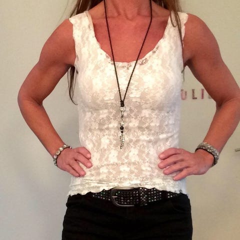 Flot top i hvid med blå broderi i blå nuancer. Den er tætsiddende og har lynlås i siden. Fantastisk til sommer med cowboy bukser og sandaler. Brystmål 80 og længde ca. 39 cm.