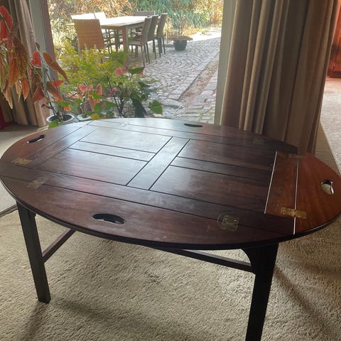 Sælger dette utroligt elegante og tidløse butlerbord i mahogni med smukke messingbeslag. Bordet har de klassiske fire opklappelige sider med udskårne håndtag, som giver det et eksklusivt og praktisk udtryk – perfekt som sofabord eller bakkebord.