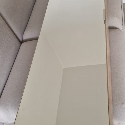 Skoskab med spejllåge i hvid. Skabet har en front med spejl og en klaplåge, der åbner ind til opbevaringsrum til sko eller andre mindre genstande. Møblet er smalt og egner sig til placering i entré eller gang, hvor der er behov for både opbevaring og spejl. Overdelen kan bruges som lille afsætningsplads. Der er sat et lille diskret læder greb på så man ikke skal fedte spejlet til hver gang man åbner.