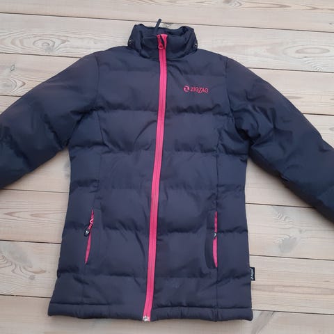 Flot og kun lidt brugt - Zigzag frakke - med 2 lommer og kraftig lynlås. Hætten er desværre blevet væk - prisen er sat derefter. Pris 75 KR.