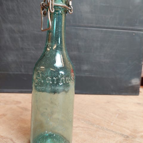 Mundblæst/hamret flaske med skjold. Se mine andre annoncer med flasker.