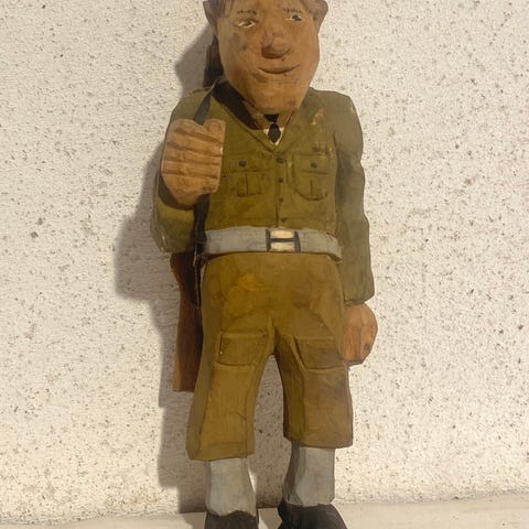 Uniformeret træfigur - “trägubbe”. Humoristisk håndskåret svensk mekanisk træfigur, såkaldt “ekivok”figur, formodentlig fra midten af 1900-tallet (ca. 1950–1970). Typisk skandinavisk folkekunst med glimt i øjet. En messingsplit kan tages ud af ryggen, og figuren kan “folde sig ud”. Naturlig og aldersrelateret patina. Træfiguren er i stil med Carl-Johan Trygg og sønners kreationer, men vi har valgt ikke at tilskrive den deres værksted, grundet manglende underskrift/datering på figuren.