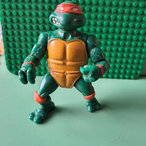 Teenage Mutant Ninja Turtles Leonardo actionfigur i grøn og blå plastik fra 1988. Figuren forestiller skildpadden Leonardo med blå maske, orange brystpanser og sort skjold på ryggen. Egnet som legetøj eller samlerfigur til leg og udstilling. Størrelse og produktionsår er ikke angivet.