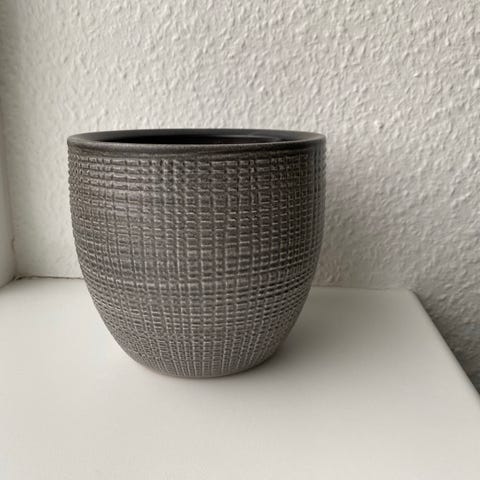 Let alu Urtepotteskjuler med fint mønster, ikke brugt. H: 17cm, ø 16cm.