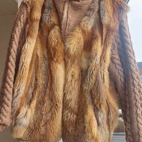 Flot pels med lommer, 130 cm lang. Et hul i pelsen ved venstre armhule, som kan repareres.