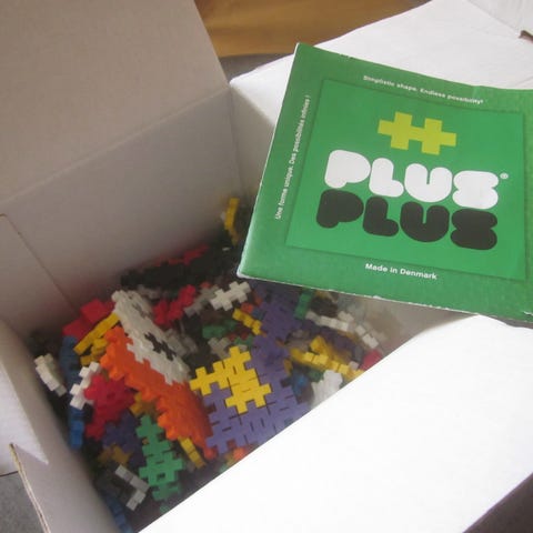 Æske med 100 stk midi Plus Plus i forskellige farver.