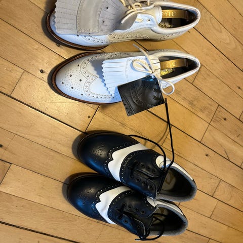 Håndsyet golfsko fra Portugal med lædersåler og softspikes. Lavet i bedre læderkvalitet i inder skoen. Fed Old Fashion sko, desværre bestilt et nummer for små. Normal i str. Ny pris + 3000,-