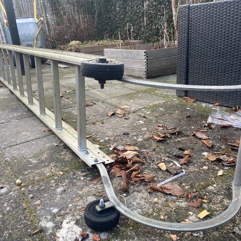 Let alu-tagstige med tagrygsbøjle. 4 meter lang og i to dele, der kan skydes ud.