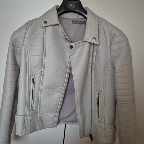 Flot jakke i str 42, lysebrun i polyurethane og viscose, med lynlås 125kr