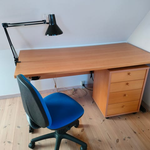 Skrivebord i brunlakeret træ med flere skuffer på begge sider samt en midterskuffe. Klassisk udformning med metalgreb på skufferne. Velegnet som arbejdsbord eller skrivebord i kontor, stue eller værelse, hvor der er behov for god opbevaringsplads i skufferne.