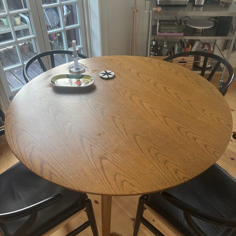 Pænt rundt spisebord, som passer godt i de små københavnere lejligheder. Jeg købte det i 2022 og har været vildt glad for det, men skal ikke bruge det mere, så nu skal det have et nyt hjem.