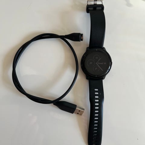 Garmin Vivoactive 3 Music smartwatch i grøn. Uret har rundt display og silikonerem med strukturmønster. Bagsiden har optisk pulssensor og opladningsstik. Modellen understøtter musikfunktioner direkte på uret samt aktivitets- og træningsregistrering. Velegnet som sports- og hverdagsur til både mænd og kvinder. Rem mangler fastholder til den løse ende.