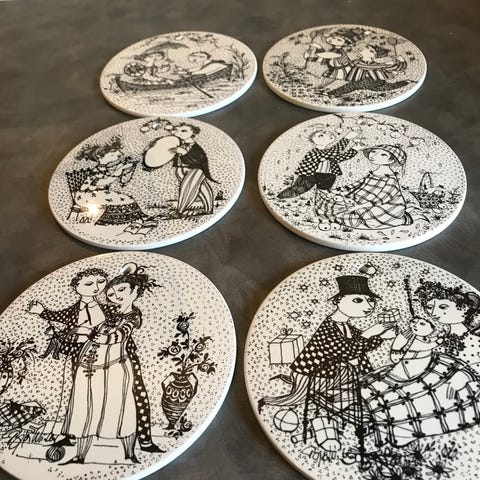 Aluminia Februar Maskerade vægplatter i porcelæn. Runde hvide platter med sort grafisk dekoration og maskerademotiv. Platterne har ophængshul på bagsiden, så de kan bruges som vægpynt. Velegnet som dekoration enkeltvis eller som serie på væggen.