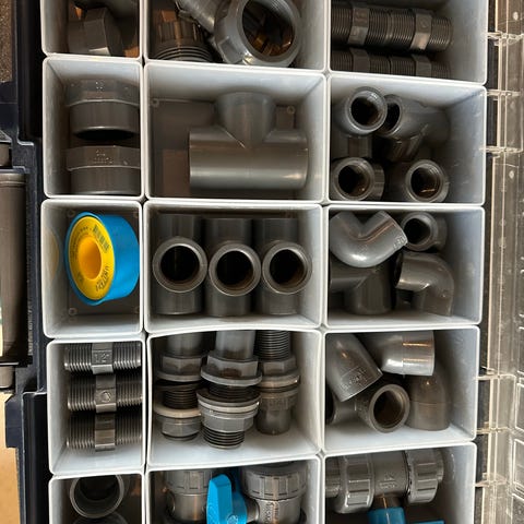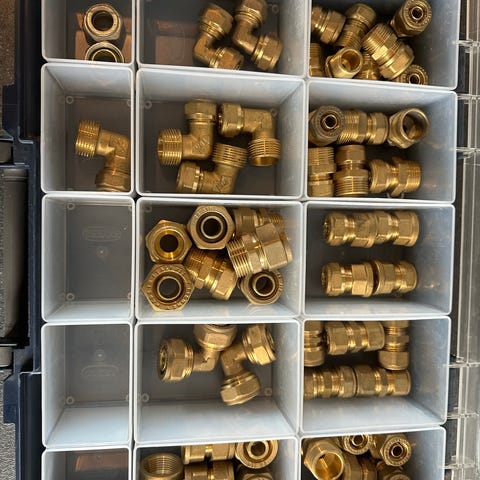 Plastik sortimentskasse med blandede VVS-fittings og koblinger