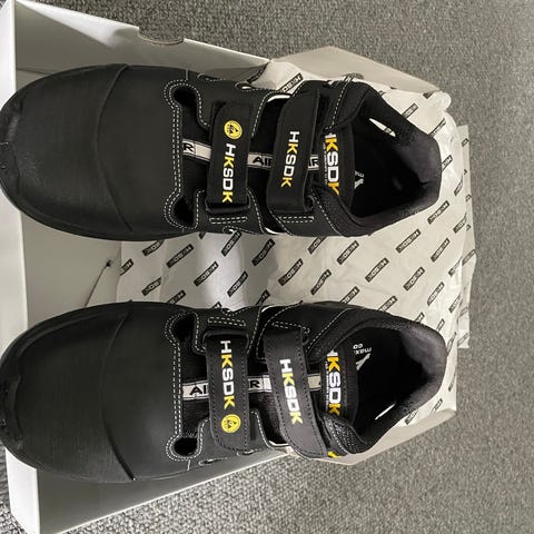 HKSDK Z2 sikkerhedssko i størrelse 44. Skoene er sorte med blå detaljer og har grovmønstret sål. Modellen er en special edition med AIR-system og lukning med drejespænde/wire-system. Skoene er designet som sikkerhedsfodtøj og er velegnede til arbejde, hvor der kræves robust fodbeskyttelse. Leveres i original æske fra HKSDK.