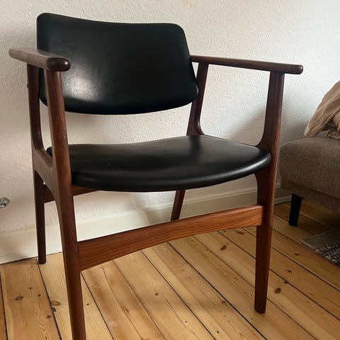 Kontorstol, original,teak, sort patineret læder, vipper lidt i stålstangen under sæde