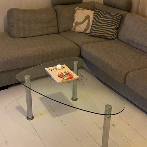 Der er almindelige brugsspor og mindre ridser i glasset, men bordet fremstår stadig pænt og fungerer helt som det skal.
