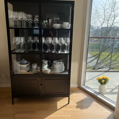 Vitrineskab til salg, udført i sortlakeret jern med tre glaslåger og glas i begge sider. Grebene er ligeledes i sortlakeret jern.