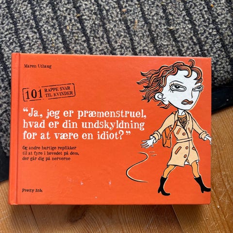 Pernille Lund "Ja, jeg er præmenstruel, hvad er din undskyldning for at være en idiot?" bog på dansk. Paperback med orange omslag og illustreret forside. Bogen indeholder korte tekster og regler om PMS og relaterede emner, opdelt i afsnit med overskrifter og nummererede sider. Egnet som humoristisk og informativ læsning for voksne læsere, der ønsker en let og underholdende bog om præmenstruelle gener og hverdagsrelationer.