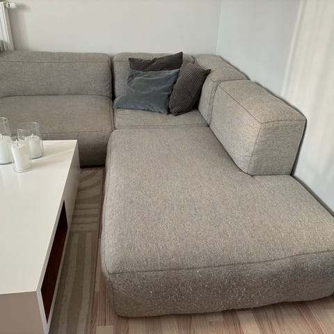 Der er et hul i det midterste modul i sofaen. Huller kan evt. repareres eller modulet fjernes, og så har man den perfekte sofa til kollegieværelset eller fællesrummet:-)