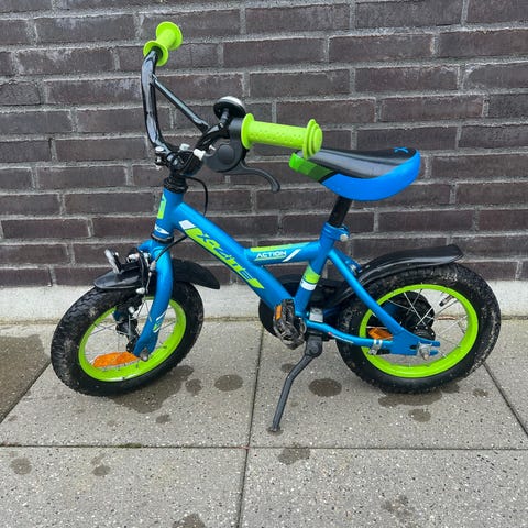 Fin X-Zite Action børnecykel med 12" hjul i blå og grøn.