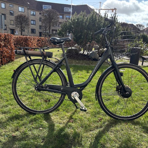 Kildemoes city,virker som skal, meget pænt,med stor batteri(36v11.6ah) forhjulsmotor ,oplader,nøgle, axa forsikringsgodkendt lås,LED lygte,kurv,bags,næsten ny dæk/kæde, Den er serviceret jævnlig. shimano nexus 7 gear, Lock-out funktion holder styret på plads, når cyklen er parkeret, ringeklokke, størrelse(52cm)28 tommer hjul, stelnummer(WBK582655S)med kvittering,pris:6500kr
