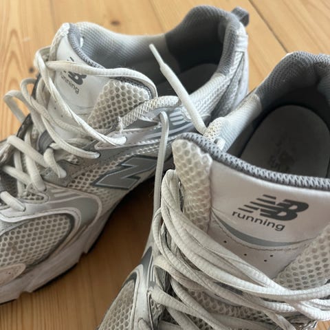 On løbesko i størrelse 44 i sort med hvid sål. Skoene har snørelukning og en ventileret overdel i mesh-lignende materiale. Mellemsålen har karakteristiske hulrum for stødabsorbering, og ydersålen har gummifelter for greb. Egnet til løb og generel træning.