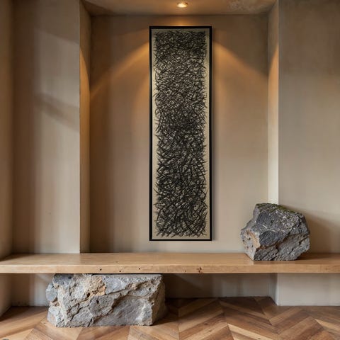 Maleriet er opspændt på en treramme med ophæng på bagsiden, klar til at blive hængt op på væggen.