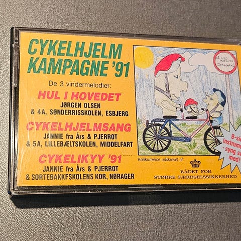 Cykelhjelmkampagne ’91 kassettebånd. Lydkassette med kampagnemateriale fra 1991. Velegnet til afspilning på kassettebåndoptager eller som samlerobjekt for lydmedier og kampagnemateriale fra perioden.