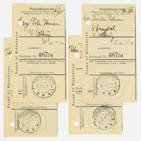 Postindkasseringer og kvitteringer for indbetaling til postkonto ved postgirokontoret. 7 stk. taloner, alle med brotypestempler fra Avnbøl, 1943 og 45. Arkivhuller i venstre side. Avnbøl var en lille postekspedition underlagt Graasten Postkontor.