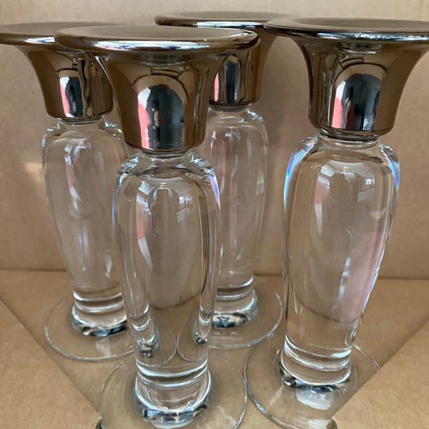 Holmegaard Lysestager i glas med metal top i sølvfarve. Stagerne er klare i glasset med rund fod og er velegnede til almindelige kronelys. Sælges som sæt med to lysestager. Egnede til brug på bord, vindueskarm eller hylde som enkel lys- og dekorationstilbehør i hjemmet. Er ca 16 cm høje.