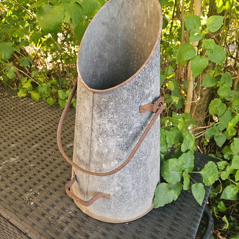 Stor gammel koks- eller kulspand i zink fra Glud og Marstrand. Denne er blevet "Almue" malet og dekoreret med blomster.