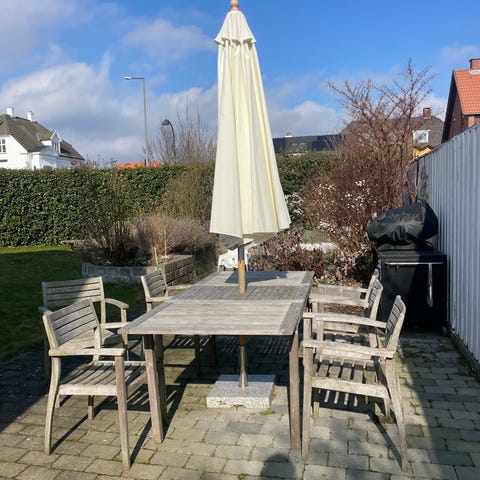 Havebord og stole sæt i teaktræ.Sættet består af et ovalt havebord med udtræksplade (som kan gemmes under bordet) I midten er der hul til parasollen Velegnet til udendørs brug på terrasse eller i have som spiseplads.