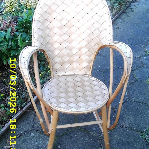 stol i flettet træ i naturfarve. Stolen har rund fletsæde, høj flettet ryg og integrerede armlæn i træ. Konstruktionen består af runde træben med tværstivere for stabilitet. Designet til indendørs brug som siddeplads i stue, køkken eller lignende opholdsrum.