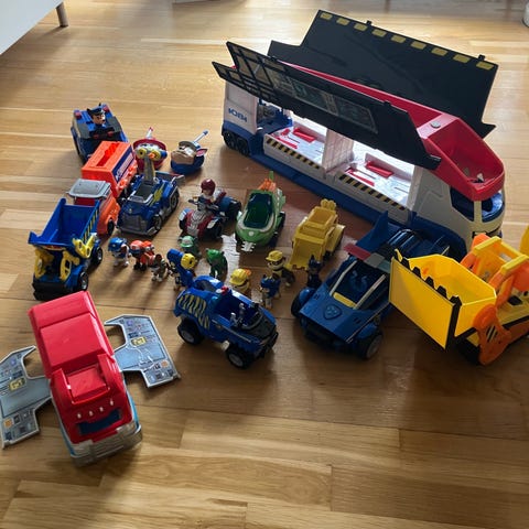 Paw Patrol legesæt bestående af udsigtstårn med spiralrampe, stor lastbil og flere figurer.