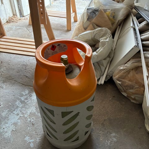 Gasflaske i komposit med tara-vægt på 5,3 kg. Flasken er i orange og hvid plast/kompositmateriale med håndtag i toppen og standardventil til tilslutning af regulator. Egnet til brug med gasgrill, campingudstyr eller andre gasapparater, der passer til denne type flaske. På flasken er angivet retest-år 2032.
