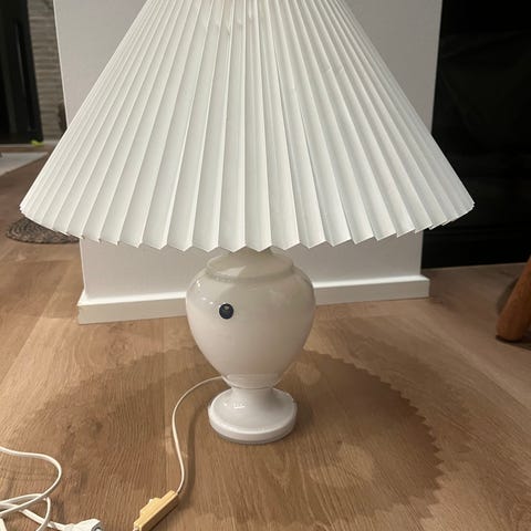 Lampens skærm er cylindrisk og har en glat, gylden overflade med blå kant. Stativet er hvidt og prydet med et dekorativt mønster.,Bemærk at mail, chat og beskeder ikke besvares, og varen skal købes på knappen "Gå til varen"