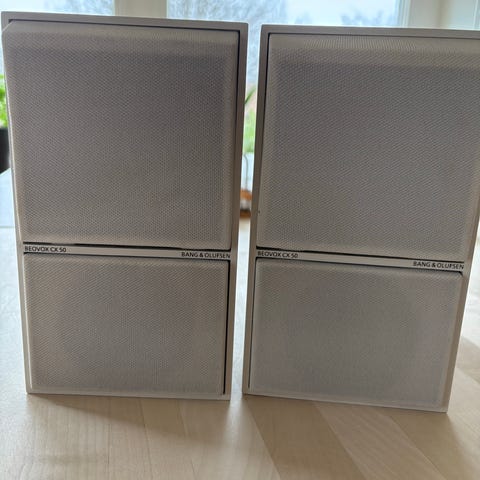 Bang & Olufsen Beovox CX50 højttalere i kompakt kubisk design. Sættet består af to passive højttalere med frontstof i sort og kabinet i lys metallisk finish. Hver højttaler er opbygget med separat diskant- og bas/mellemtone-enhed placeret i de to sektioner. Velegnet til brug sammen med kompatible Bang & Olufsen forstærkere eller andre anlæg med passende effektudgang. Klassisk B&O design egnet til reolsystemer eller mindre rum, hvor der ønskes diskret placering.
