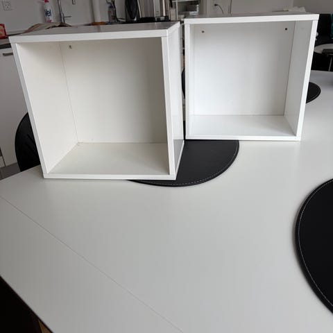 To hvide kasser, der er pæne og brugt meget lidt. Der er sat filtfødder på, fordi de stod som natborde i 14 dage. De bruges ikke mere og står bare og fylder i skabet.