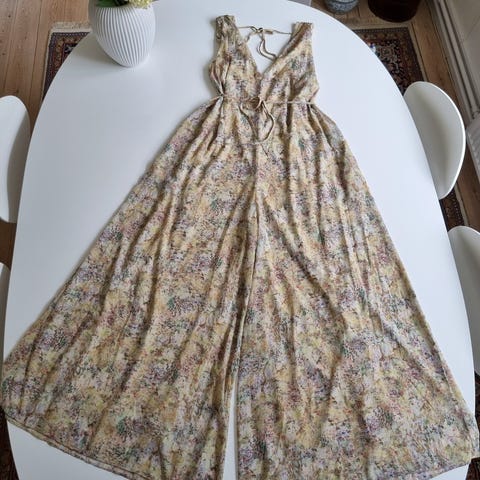 Hunkemöller buksedragt til kvinder i størrelse L. Buksedragten er beige med mønster og er fremstillet i viskose. Modellen har elastik i taljen med bindesnor og sidelommer. Overdelen har blonder og stropper, og benene er lange med løs pasform. Velegnet som afslappet hjemme- eller loungewear.