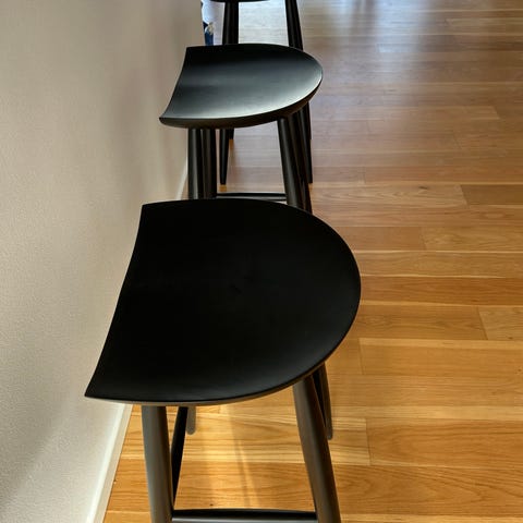 To fine nye barstole med sæde af mangotræ og stellet er af sort metal. De er stadig indpakning og er i kategorien "samle selv".