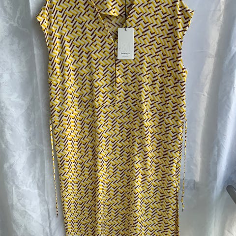 Flot sommerkjole i fin blank brun farve. Kjolen er aldrig brugt, dog uden prismærke. Kjolen kan bruges både til hverdag og til fest. Lukkes med en lille knappe.