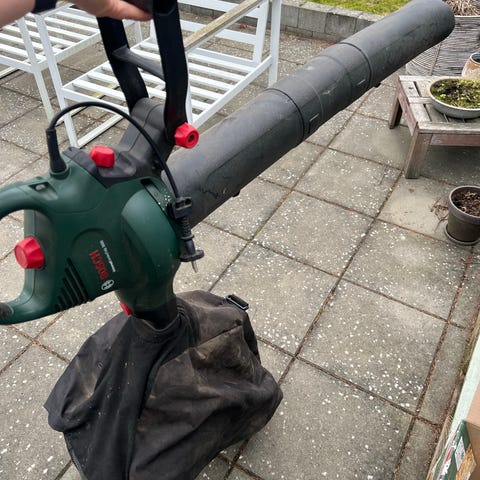 Eldrevet model med håndtag og langt rør til opsamling af blade og mindre haveaffald.