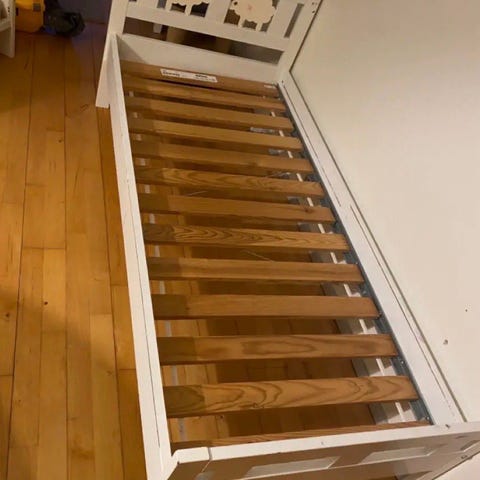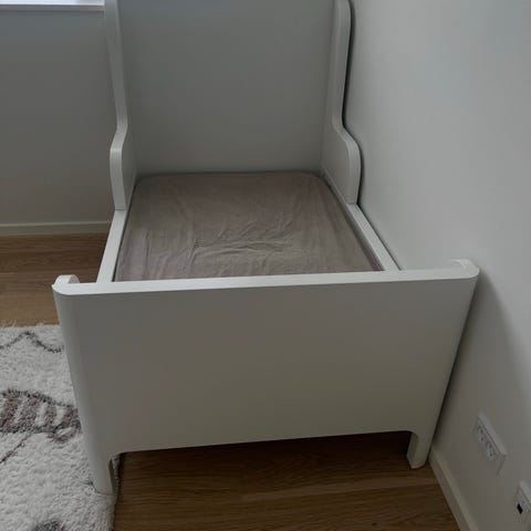 IKEA juniorseng (Busunge) i pink farve. Sengen er egnet til børn, som er vokset ud af tremmeseng, men endnu ikke klar til en almindelig enkeltseng. Kan dog trækkes ud til 200 cm længde. Er 80 cm bred. Velegnet til børneværelse, hvor der ønskes en mindre seng med høj gavl ved hovedenden og lavere fodende.
