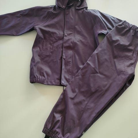 Nypris 400 kr. Mørkelilla regntøj, str. 116 (kan også bruges i str. 122). Brugt én gang, som nyt. OBS hætte mangler.