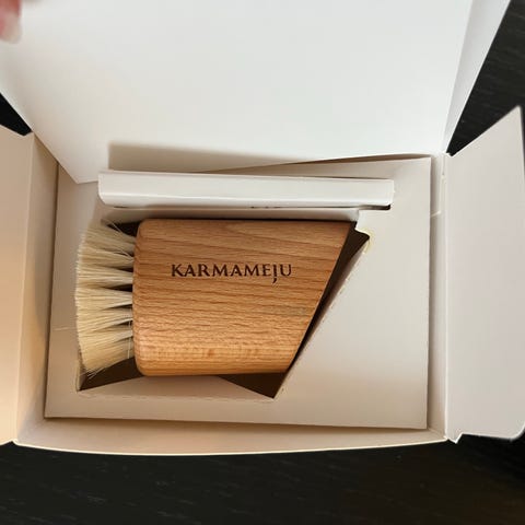 Karmameju tørbørsterne er unikke - udviklet og formgivet af Karmameju i forhold til hårdhed, hårtype, hårmængde og hårlængde og i FSC-certificeret træ af Karmameju. Det nye, længere skaft er ligeledes udviklet af Karmameju, for den optimale børsteoplevelse og effekt på huden. Man vil opleve, at børsterne er blødere i børstehår, end de fleste børster på markedet.